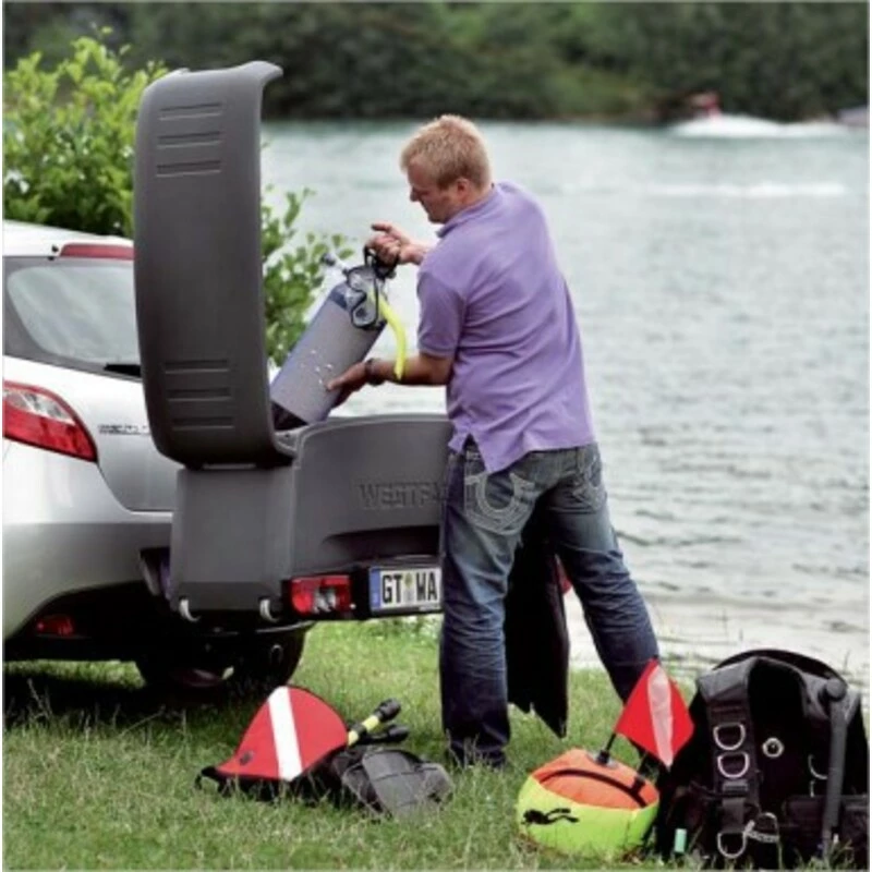 Le coffre Westfalia est une solution de rangement supplémentaire. Sa fonction basculante permet d’avoir toujours accès au coffre du véhicule en toute circonstance même quand le coffre est installé sur le porte-vélos. Ce produit est également équipé d’un système de fermeture à clé verrouillable sur le véhicule.