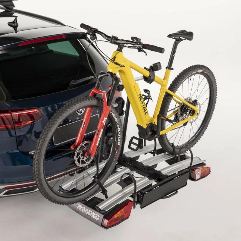 Le Menabo Antares 3 peut transporter 3 vélos d’une charge totale de 60 kg (3 vélos standards de 20kg) et jusqu’à 30 kg par vélos (limité à 2 vélos de 30kg max). Il est parfaitement adapté pour transporter jusqu’à 2 vélos électriques et même des Fatbikes aux roues très larges !