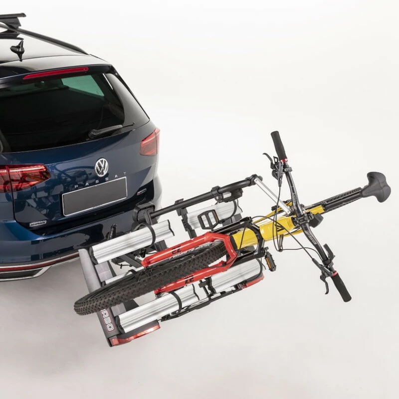 Ses principaux atouts : basculable, verrouillable sur la rotule et les cadres de vélos, repliable, jusqu’à 3 vélos transportables pour 60 kg de charge max, compatible vélos électriques et Fatbikes.