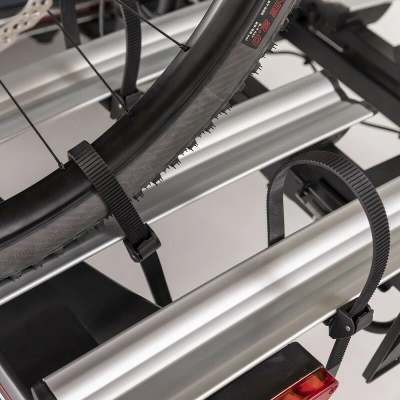 Les vélos sont fermement maintenus au niveau des roues par de longues et résistantes courroies crantées (47 cm). Les cadres sont agrippés par des bras de fixation réglables dont les mâchoires sont verrouillables à clé. La sécurité de l’ensemble des vélos est renforcée par la présence d’une longue sangle les maintenant tous ensembles.